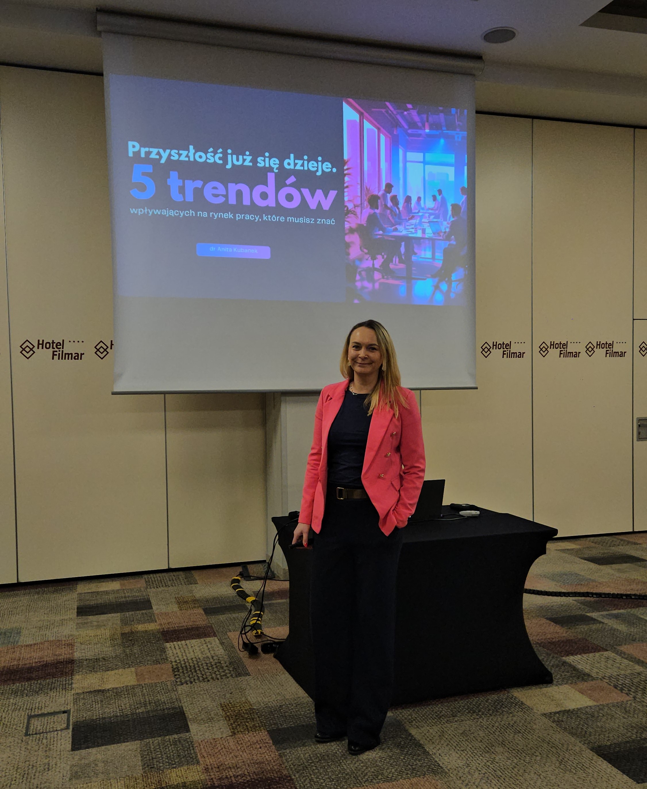 W ramach konferencji dr Anita Kubanek wygłosiła prelekcję pt. „Przyszłość już się dzieje. 5 trendów wpływających na rynek pracy, które musisz znać”, prezentując kluczowe zjawiska kształtujące współczesne modele pracy. Szczególną uwagę poświęcono roli sztucznej inteligencji, automatyzacji oraz zmian technologicznych, które już dziś wpływają na zapotrzebowanie na nowe kompetencje, sposób organizacji pracy i kierunki rozwoju pracowników oraz organizacji.